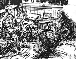 I told him who I knew that he knew. He named some people I knew. We were on the same ground then and he shook hands, reached back into the rucksack, and added an exact quarter-inch to the Scotch in our glasses to show his approval of my being allowed to hang around the area for a few days.