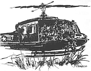 We sat there on the metal floor of the Huey, wind blowing in the open doors, gear feeling awkward, looking down at the watery-green surface or occasionally at another helicopter filled with men doing the same. Blankly staring out the door or picking at some buckle or strap on a piece of gear as if it were very important, the rotor and wind noises stop conversation, every man is involved in the very private world of "sweating it out."