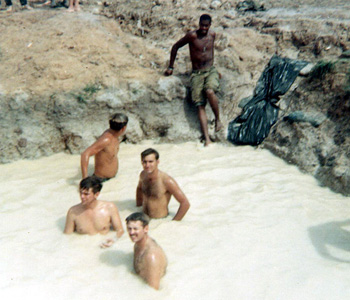 Yet, with all the activity in the area, the men enjoyed an afternoon or a day off, and the Blue Tigers were no exception. For such occasion, they built a swimming pool in the field. Using the field-expedient method, the men took advantage of an old 1000-pound bomb crater nearby. With some heavy equipment, the crater was dug deeper and wider, and filled with Vietnam's own muddy water. It was a place to cool off when that hot sun got to be too much. There were always a couple dozen men floating around on air mattresses with cokes or beer in their hands, reminiscing about the good old days at the swimming hole.