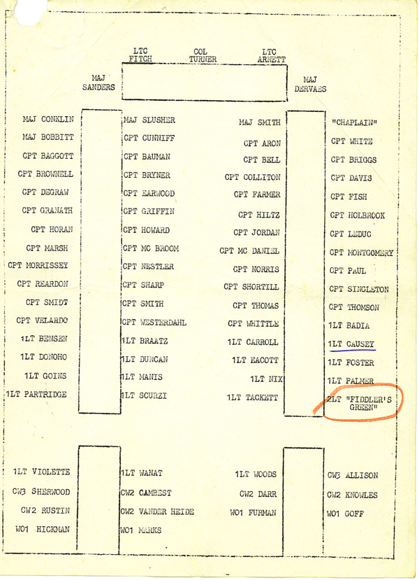 DEPARTMENT OF THE ARMY 1 August 1969 GENERAL ORDERS TC 000. It is with the most distinguished pleasure that I formally notify you, 2LT Robert F. Bennett Jr, XXX-XX-XXXX, of your exonerated position within the Squadron. I personally assure you that only great care and attention to detail resulted in your selection to be the Narrator of the famed "Fiddlers' Green". This is a most discerning honor indeed. After careful scrutiny of the Officers Roster, it was determined that you have the distinction of having one of the lowest Dates of Rank. Much deliberation occurred, but YOU were ultimately selected through the complex process of numerical elimination. I would like to take this opportunity to present my Congratulations and further inform you that the attached iambic verse, "Fiddlers' Green", will be memorized and ready for recitation not later than 1900 hours, 6 August 1969 at the scheduled "Dinner Party". This recital is in keeping with the highest of Cavalry Traditions, and most befitting of your impeccable position within the Squadron. The Executive Officer of your Troop will render his professional guidance in assuring that you have committed to flawless memory, "Fiddlers' Green". FOR THE COMMANDER: JAMES P. CAUSEY Jr |