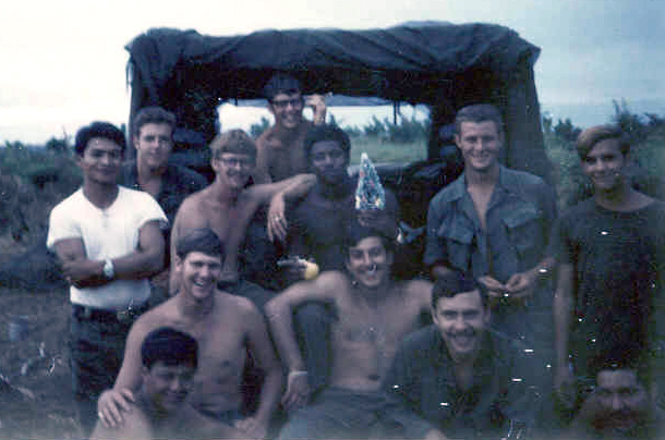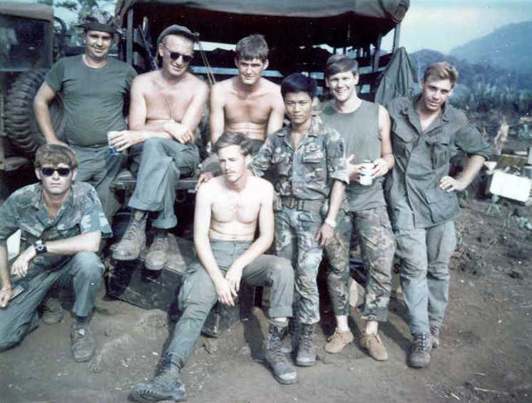 VIET15.JPG Standing: Lee Ballinger, John Nyikos Back row kneeling: Munson, Richard Shatley, Doc David Morris Middle row kneeling: Thomas Fortner, Doug Peck, unknown Front: Sterling Withers Location: Side of Nui Chua Chan From the Sterling Withers Collection