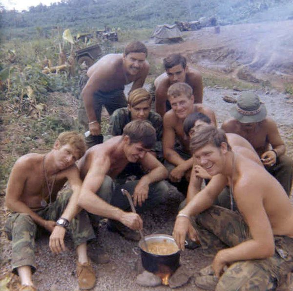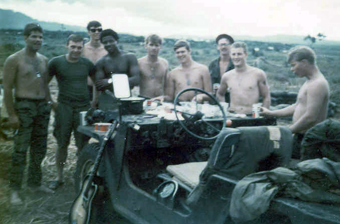 VIET20.JPG l-r: Lt Cowan, Marvin Carlisle, unknown, Marvin Hughes, Thomas Fortner, Sterling Withers, John Alexander, Richard Shadley, Billy "Tadpole" McCall Location: West of Nui Chua Chan From the Sterling Withers Collection