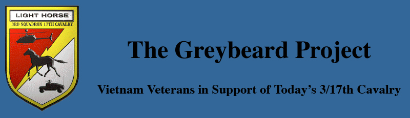 UPDATE - AUGUST 25, 2005 CHANGESAfter the successful start of Operation Greybeard in 1999, we continued to work with successive commanders of the 3/17th U.S. Cavalry until after the air troops of the 3/17th shipped to Iraq in 2003. For Christmas 2003, we shipped CARE packages and children's Christmas cards to the Apaches of A Troop in Afghanistan. They had shipped to Afghanistan before the air troops went to Iraq, continuing the 3/17th's well-established tradition of squadron fragmentation and dispersal. After Apache Troop rotated home from Afghanistan, the Army reorganized the 3/17th Cavalry, reassigning the ground cavalry troop to another unit and turning the 3/17th into an aviation battalion. The Apaches of A Troop are no more. A Troop, 3/17th is now a helicopter troop known once again as the Silver Spurs. This change got enthusiastic support from several Silver Spur veterans, who took over the function of the Greybeard Project. They farmed out CARE package preparation to professional organizations, and established liaison with the 3/17th at Ft. Drum. As a result, the Greybeard Project pages are now a part of 3/17th Air Cavalry history for the period 1999 to 2003, and will not be updated. Further inquiries should be directed to the Silver Spurs website. The original Greybeard Project pages follow: The Greybeard ProjectWebmasters Roger Young, Skip Davis, and Bill Nevius have joined forces to create the Greybeard Project - a project to make the resources of the Vietnam veterans of the 3/17th Air Cavalry available to the current troopers of the 3/17th U.S. Cavalry. We have found that the 3/17th U.S. Cavalry is alive and well as part of the 10th Aviation Brigade in the 10th Mountain Division at Fort Drum, New York. The squadron remains an independent air cavalry squadron, although armament, vehicles, and aircraft are quite different from those used by the squadron in Vietnam. The squadron is organized a little differently, with the Bluetigers of Delta Troop now known as the Apaches of Alpha Troop. The three Vietnam-era air cavalry troops, A, B and C Troops, are now combined into Bravo (Blackjack) and Charlie (Crazyhorse) Troops. Today's Delta Troop (recently renamed to "the Blue Tigers) is the maintenance troop. While the Vietnam-era squadron numbered some 1200 troopers, today's squadron totals about 250 troopers. Alpha Troop rides HMMWV vehicles in place of jeeps, and Bravo and Charlie Troops fly OH-58D Kiowas exclusively. A Little BackgroundContact between the webmasters and the squadron began with a search for historical information. The squadron Executive Officer, Major Jon Goodsmith, made the mistake of answering his own phone, and, in a conversation with Bill Nevius, each party discovered a profound ignorance about the activities of the other. And both discovered a sincere interest in replacing ignorance with knowledge. It soon became clear that there is a natural linkage between the past and the present. When the word was passed that there were three web sites actively documenting the 3/17th in Vietnam, the 3/17th Commanding Officer, LTC Patrick Plourd, and the squadron Command Sergeant Major, CSM James Dale, began visiting the Silver Spur, Burning Stogie, and Bluetiger web sites to learn what they could about the history of the squadron in Vietnam. The webmasters have chosen to respond to this newly-discovered interest by creating the "Greybeard Project". Its purpose is two-fold:
