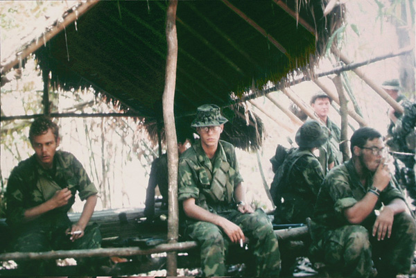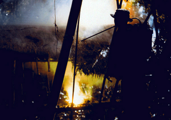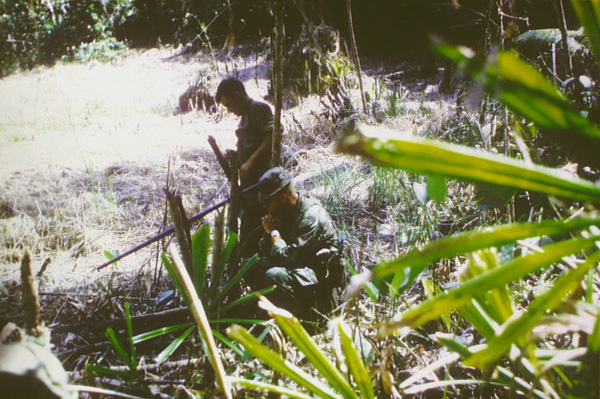 Barely visible in the center, a prone trooper (with boots toward the camera) We knew what had taken place there and we were very upset by the whole thing. ![]() From the Bob Bennett Collection We were very pissed. We burned the place to the ground. ![]() From the Bob Bennett Collection I snapped a final picture of Ranger 6, MAJ Richard W. Drisko, in a contemplative mood as he reflects on the destruction of the abandoned POW camp. ![]() From the Bob Bennett Collection |