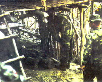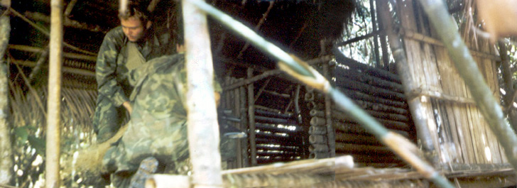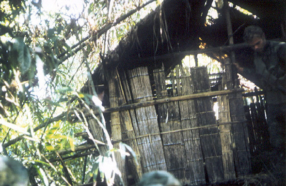 ![]() A Blue Tiger trooper inspects one of the hooches. The main floor of the hooches was elevated off the ground. According to POW Marc Cayer's statements,the VC cadre slept on this level at night and the POW's were stored here during the day. ![]() Since there are no doors visible on the rooms at the rear, At night, the POW's were stored in pits under the hooch. The pits were rancid smelling. The stench told us that the prisoners (Americans) must have been kept there, since no one could live voluntarily in such filth. ![]()