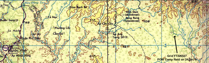 This report dovetails with our activity in War Zone D and the date on my pictures. But the Redhorse Review story does not mention the 2nd platoon, although it is possible that we went in on the January 21 "LRRP" operation and the story just forgot to mention us and the other Blue Tiger platoon in the January 21 operation. The "200-250 bunkers and hooches" does not make any sense either, if it refers to our POW camp raid. We found only about ten hooches. Two hundred fifty hoochs would be a huge camp, and I am sure I would have remembered that, rather than remembering a cluster of ten hooches. Finally, the story says that the camp "will be destroyed". My pictures show that we destroyed the POW camp while we were there. In the paragraph preceding the finding of the 200-300 bunkers in the Redhorse Review article, it simply states that second platoon, "while making their reconnaissance sweeps through the suspected enemy area . . . found many hooches and bunkers. These bunkers were destroyed, and the rest of the equipment and goods were brought back and turned over for intelligence purposes." Although ambiguously written, it covers the origins of my pictures. Since the Bright Light raids were secret, I am not surprised that the Redhorse Review article does not match our POW raid. I don't remember now whether the first Redhorse Review incident quoted above actually happened, or whether it is just a cover story for the secret raid. It is some relief to know that no POW raid succeeded in liberating POW's. The Blue Tigers who took part in the raid were very upset at failing to free any American captives. Bob Bennett Update - 10Jan01After viewing this page, George J. Veith reviewed his personal data base of all POW raids that he has been able to uncover from a variety of sources. He has identified this raid from a D-75th Ranger After Action report. It was named "Toan Thang IV," although that name was probably the overall name of the operation. The raid took place on 24 Jan 70 at grid YT 326527.12 I have left Bob Bennett's story of the raid as he originally wrote it so that the reader can measure the remarkable accuracy of his recollection of the units involved, the general location of the raid, and the approximate date of the raid. With Veith's information, the exact location of the raid can be mapped - about 35 clicks east of Phuoc Vinh and about 10 clicks southeast of Rang Rang, in the northeast quadrant of War Zone D: ![]() Map courtesy of Jim Henthorn George J. Veith also confirms that Bob Bennett and I did not have a prayer of finding reference to the raid in published sources. After Mr. Veith found the raid identified in a D-75th Ranger After Action report, he reviewed his extensive holding of original sources for JPRC activities and found no reference to the raid. He writes: